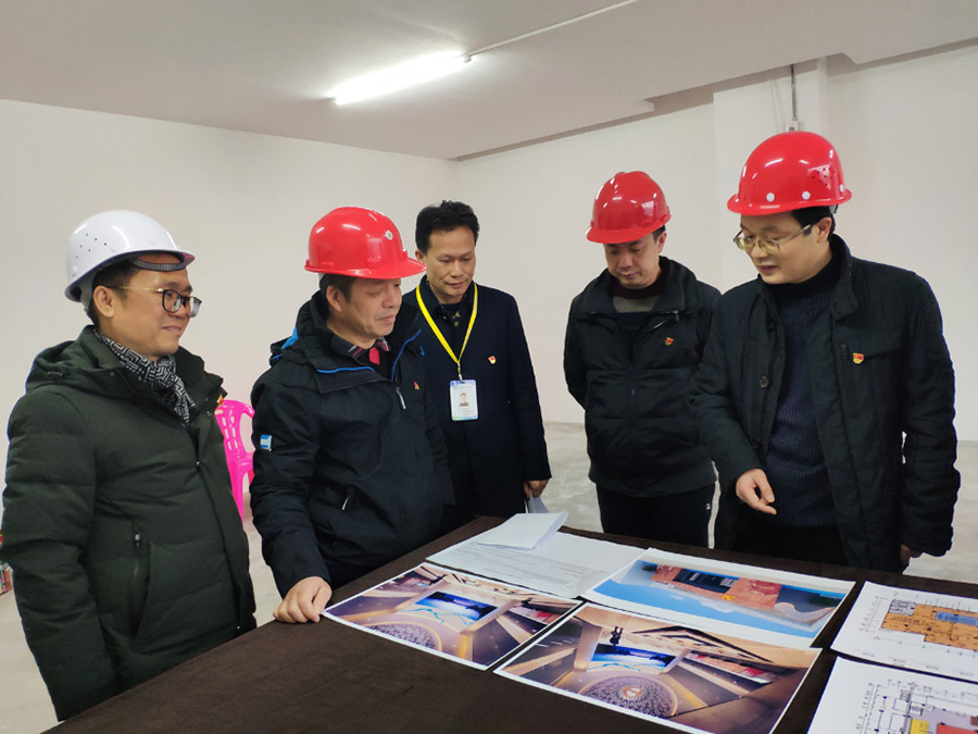 圖為周道林向工委領導介紹黨群服務中心設計效果圖相關情況