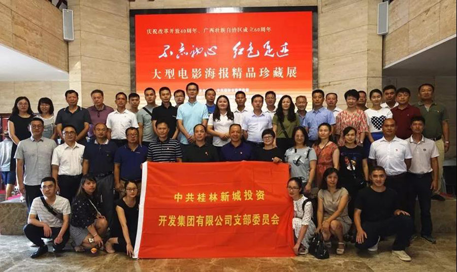 為深入學習貫徹落實習近平新時代中國特色社會主義思想和黨的十九大精神,慶祝改革開放40周年、自治區(qū)成立60周年,2018年8月23日上午新城投資集團黨支部組織全體黨員和中層副職以上干部參觀“不忘初心?紅色足跡”大型電影海報精品珍藏展。臨桂新區(qū)工委委員、臨桂新區(qū)管委會副主任覃正東,新城投資集團黨支部書記周道林以普通黨員身份參加了此次活動。