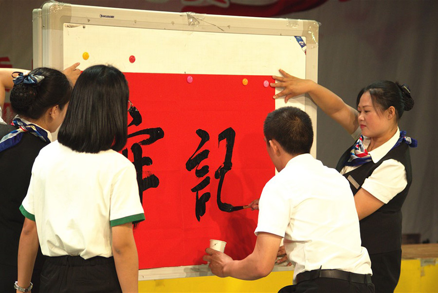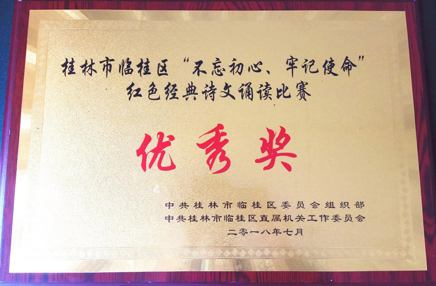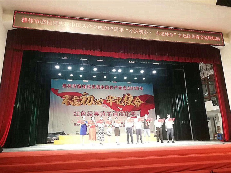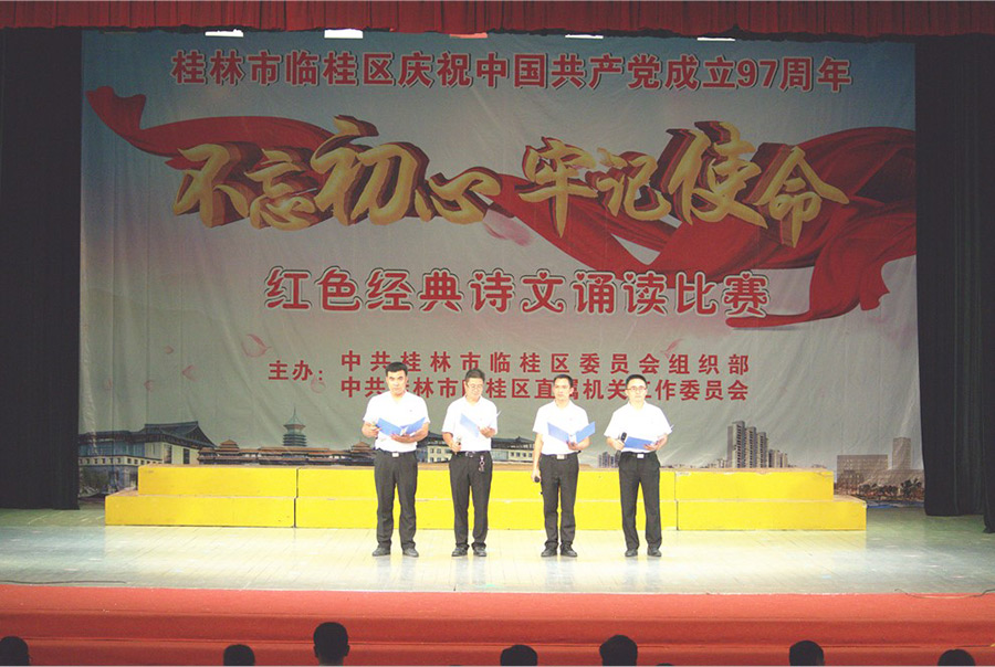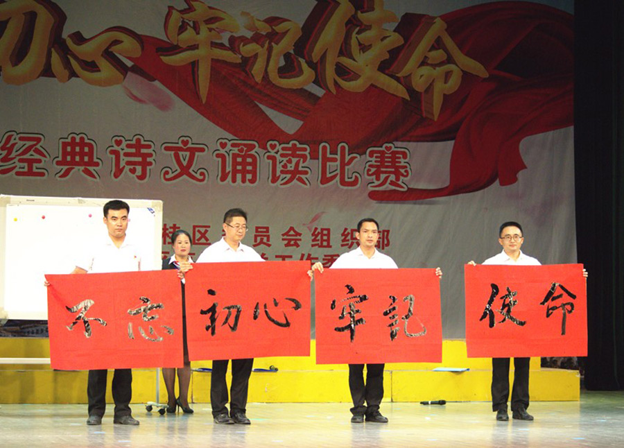 活動(dòng)中,選手們通過朗誦紅色經(jīng)典詩詞,深情回顧黨的光輝歷程、謳歌黨的豐功偉績,真誠地表達(dá)了對黨、對祖國的擁護(hù)與熱愛之情。參賽選手們儀態(tài)莊重大方,朗誦聲情并茂,以配樂、舞蹈、書法展示等多種形式,或深情款款、或激情高昂,用飽滿的熱情將紅色經(jīng)典的內(nèi)涵精彩地展現(xiàn)在觀眾面前,充分展示了臨桂區(qū)廣大黨員干部的良好精神風(fēng)貌。新城投資集團(tuán)黨支部四名黨員聲情并茂地共誦《不忘初心,牢記使命,我們永遠(yuǎn)在路上》,節(jié)目形式新穎,選手感情充沛,朗讀完詩歌后,黨員譚佳璐現(xiàn)場飽含情感的用毛筆書寫了“不忘初心,牢記使命”八個(gè)大字,表達(dá)了黨員們樹立遠(yuǎn)大的理想、力爭上游、為祖國的強(qiáng)盛貢獻(xiàn)力量的決心。與其說這是紅色經(jīng)典詩文誦讀,不如說這是一次視聽盛宴,更是黨員們愛黨愛國的精彩演繹。