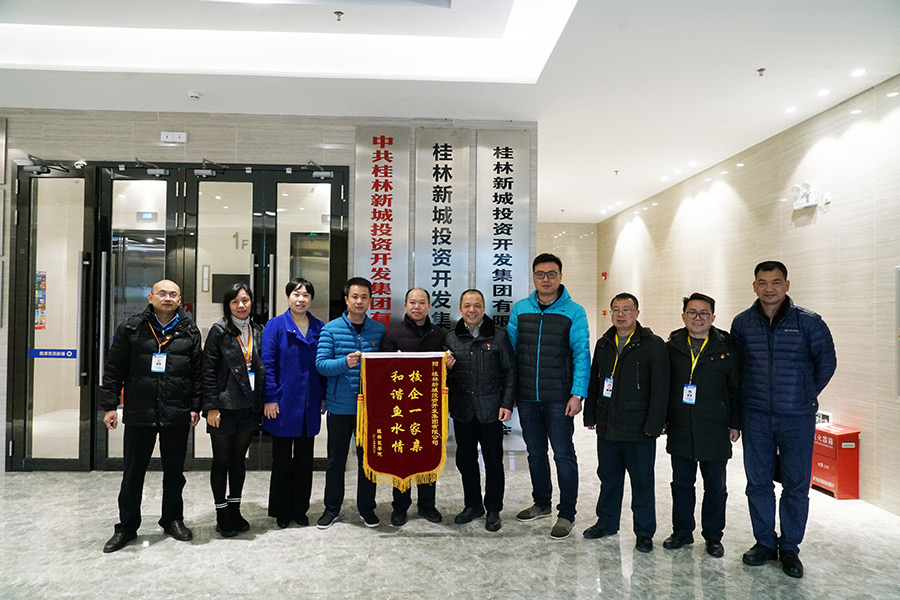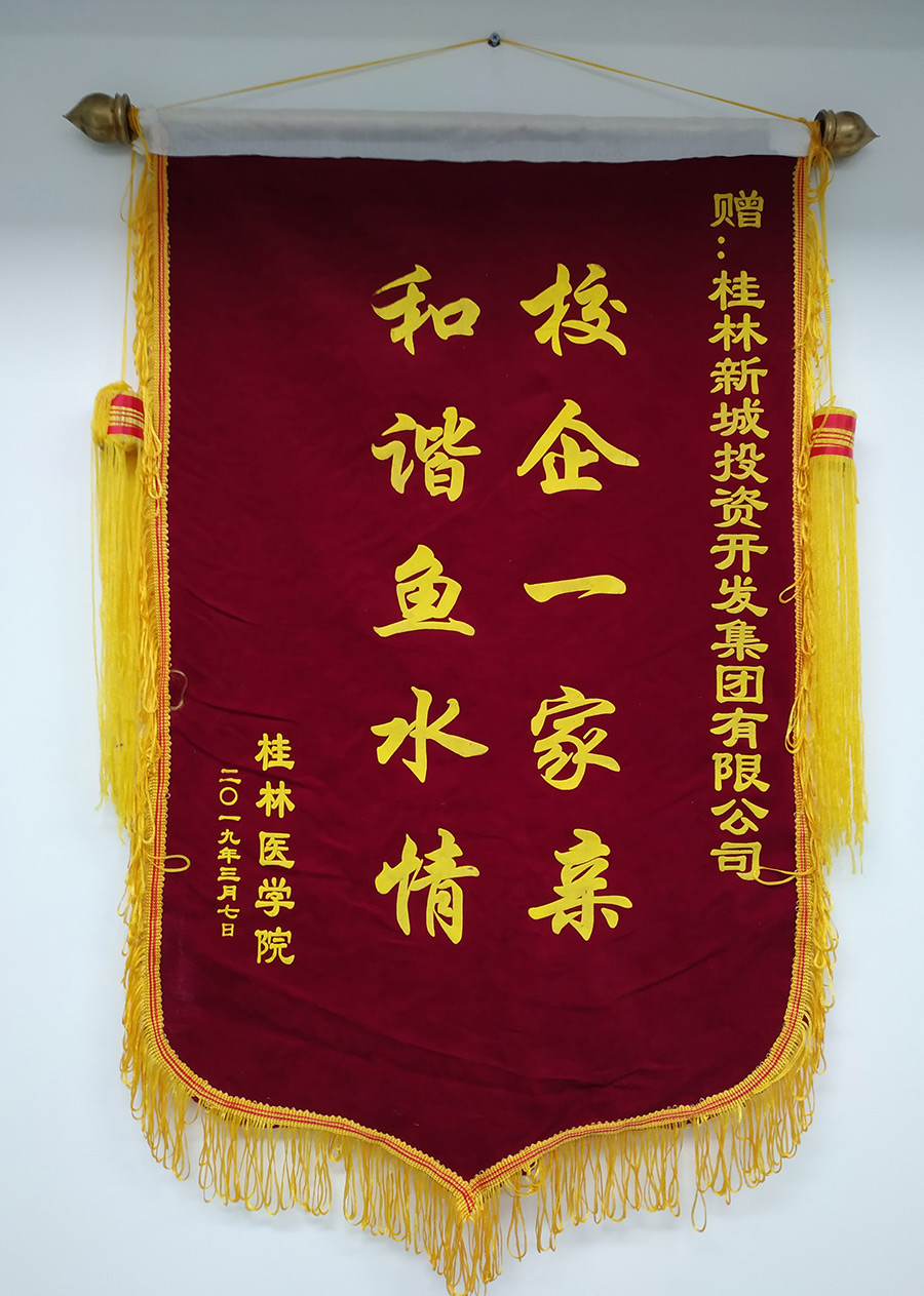 圖為桂林醫(yī)學(xué)院院長(zhǎng)助理覃克強(qiáng)一行向新城投資集團(tuán)贈(zèng)送錦旗