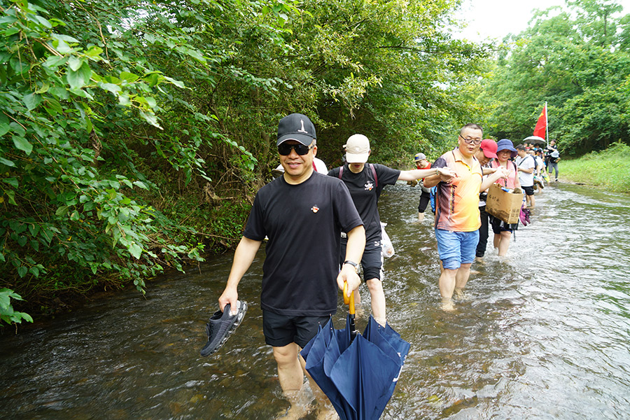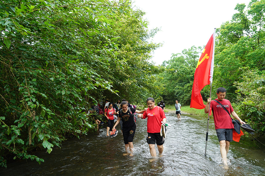 大雨過后,烈日當(dāng)空,地表溫度迅速上升,空氣中的水蒸氣增多,汗液難于蒸發(fā),面對濕熱天氣,大家義無反顧的前進,衣服濕了又干,干了又濕。中午14點,隊伍進入一片樹林,起初地勢較為平坦、道路開闊……漸漸地,地面開始凹凸不平,有了越來越多的水坑,道路開始變窄,一條小溪攔住了隊伍。大家紛紛脫鞋下水,手拉著手、攙扶著后面的同志在溪水中行進,本著不能讓任何一個同志掉隊的信念,整個團隊相互鼓勁、相互扶持,克服困難,攜手踏過這段溪流。