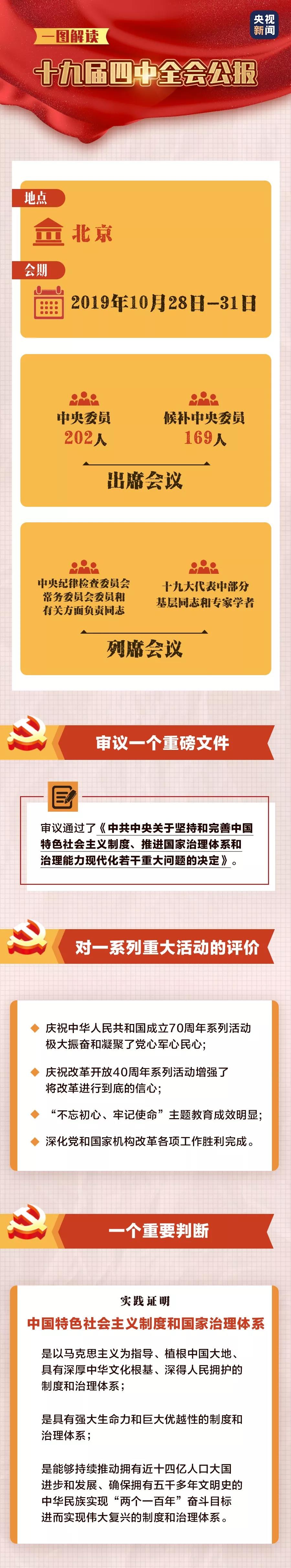黨的十九屆四中全會(huì)在北京勝利閉幕,這是在慶祝新中國成立70周年的重要節(jié)點(diǎn),向全面建成小康社會(huì)、實(shí)現(xiàn)第一個(gè)百年奮斗目標(biāo)邁進(jìn)的關(guān)鍵之年召開的一次重要會(huì)議,充分肯定我們黨治理國家取得的歷史性成就,全面總結(jié)我國國家制度和國家治理體系的顯著優(yōu)勢(shì),明確了加強(qiáng)和完善國家治理必須堅(jiān)持的基本原則以及總體目標(biāo)、工作要求,為堅(jiān)定制度自信、實(shí)現(xiàn)偉大夢(mèng)想提供了根本遵循,指明了正確方向。