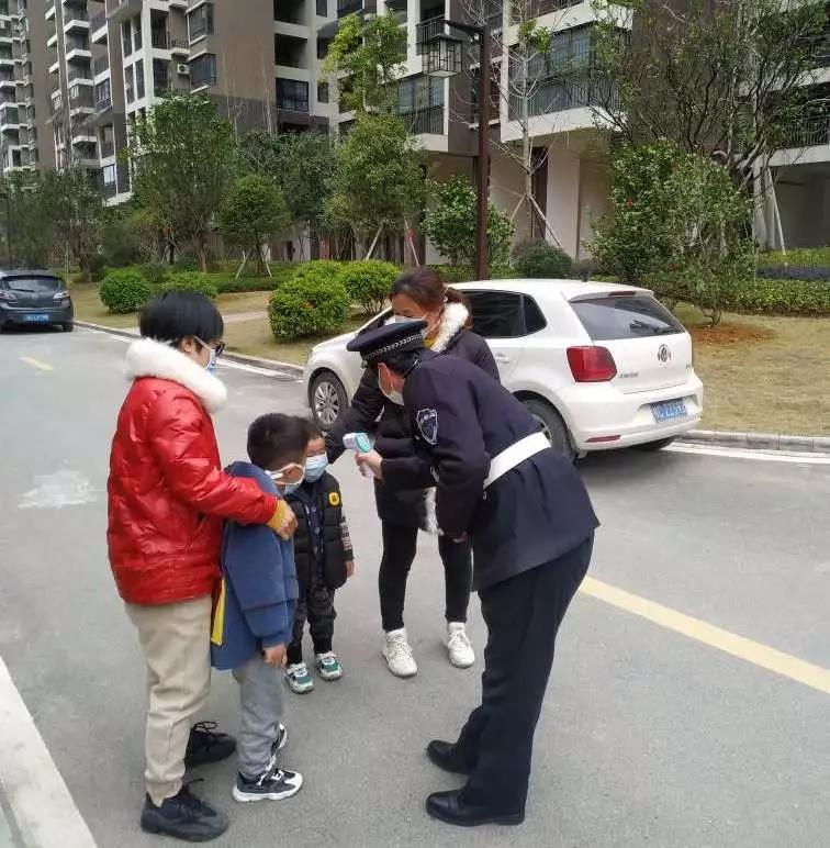 ▲新城國(guó)奧小區(qū)工作人員為業(yè)主測(cè)量體溫。