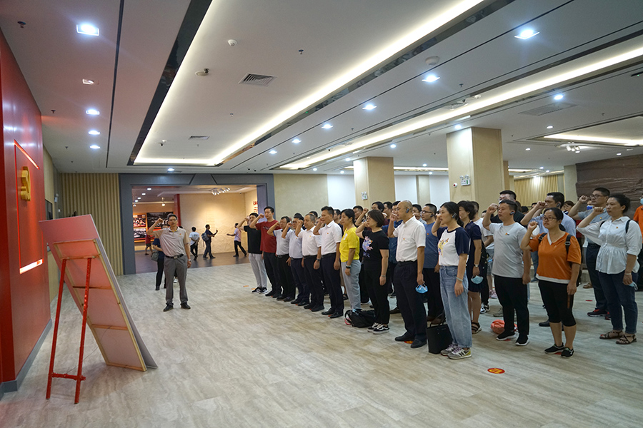 在紀(jì)念館,黨員們仔細觀看館內(nèi)所陳列的各種珍貴文物、文獻、照片等資料,伴隨著講解員動情的解說,大家懷著敬仰的心情默默聆聽,重溫紅色記憶,追尋革命足跡。在趙新明的領(lǐng)誓下,全體黨員重溫入黨誓詞。