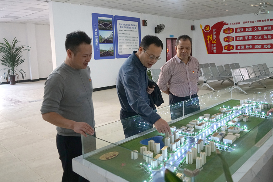 11月18日下午,臨桂新區(qū)工委委員、管委會副主任蔣玖明一行到西城大道南延長線道路提升工程項目現(xiàn)場調(diào)研,指導(dǎo)西城大道南延長線項目聯(lián)合黨支部黨建工作。臨桂新區(qū)工委組織人事部部長、創(chuàng)建領(lǐng)導(dǎo)小組辦公室主任梁利,新區(qū)黨總支委員、創(chuàng)建領(lǐng)導(dǎo)小組辦公室副主任藍方,新城投資集團黨總支書記、董事長、總經(jīng)理周道林,黨總支組織委員、工會主席譚力源陪同調(diào)研。