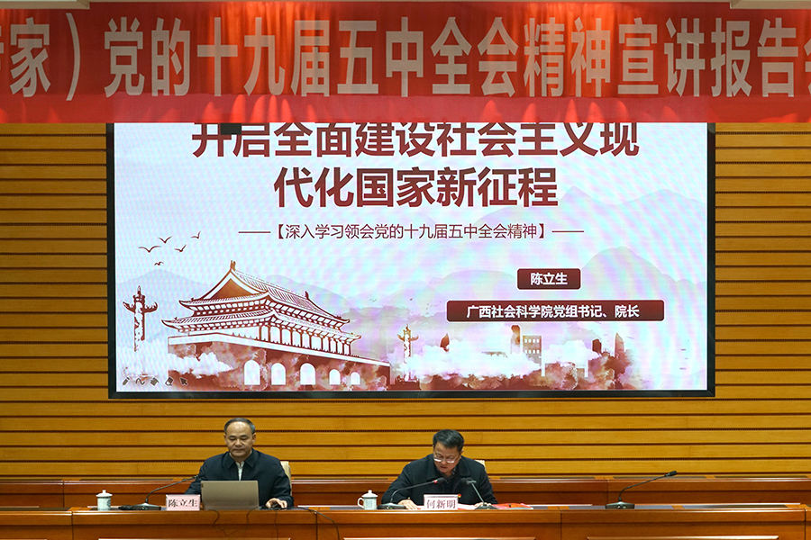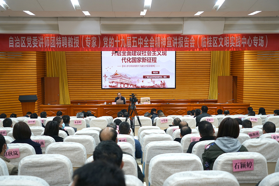 11月27日上午,自治區(qū)黨委講師團黨的十九屆五中全會精神宣講報告會在臨桂新區(qū)工委會議室舉行。廣西社會科學院黨組書記、院長陳立生作了題為“開啟全面建設社會主義現(xiàn)代化國家新征程”宣講。臨桂新區(qū)工委第一副書記、管委會主任、臨桂區(qū)區(qū)委書記何新明主持報告會,并作臨桂新區(qū)黨的十九屆五中全會精神學習動員講話。