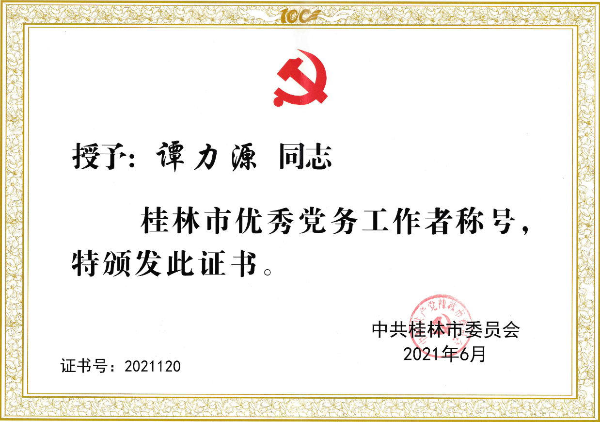 在慶祝中國共產(chǎn)黨成立100周年之際,為弘揚正氣、樹立標桿,激勵各級黨組織和廣大共產(chǎn)黨員堅守初心、勇?lián)姑?、奮發(fā)有為,市委決定對150名共產(chǎn)黨員、120名黨務(wù)工作者、150個先進基層黨組織予以表彰,分別授予“桂林市優(yōu)秀共產(chǎn)黨員”、“桂林市優(yōu)秀黨務(wù)工作者”、“桂林市先進基層黨組織”稱號。