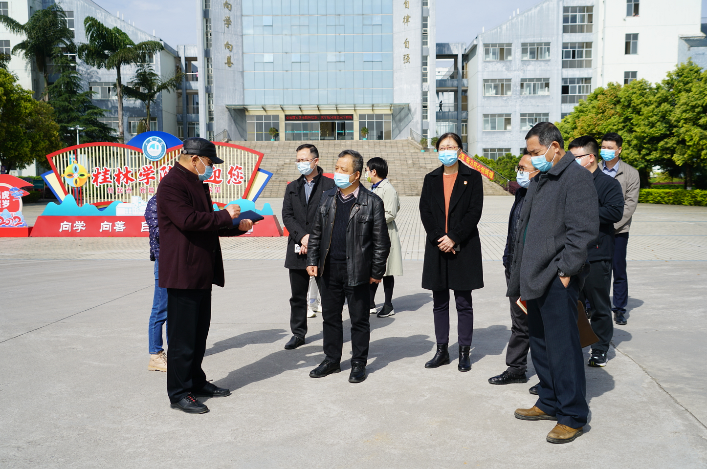 在學(xué)校門口,檢查組重點(diǎn)檢查了師生進(jìn)出校門體溫、健康碼、行程碼核驗(yàn)情況,查看了學(xué)生離校批條,詳細(xì)了解了學(xué)校疫情報告制度、措施等情況。檢查組指出,要嚴(yán)格把好入?!瓣P(guān)口”,關(guān)閉其他進(jìn)出通道,師生員工進(jìn)出必須核驗(yàn)身份、查驗(yàn)體溫、“亮”碼通行,校外無關(guān)人員一律不準(zhǔn)入校。檢查組隨后對各類防疫物資儲備及管控情況進(jìn)行了檢查,確保防疫物資安全有效,對衛(wèi)生所、隔離觀察區(qū)、建設(shè)工地等重點(diǎn)區(qū)域疫情防控工作進(jìn)行檢查,對學(xué)校師生員工的生活情況、即將到來的“廣西三月三和清明”雙節(jié)的學(xué)生放假情況進(jìn)行了解,對安全保衛(wèi)、學(xué)生管理等問題與相關(guān)負(fù)責(zé)人、管理人員進(jìn)行座談交流。會上針對嚴(yán)格貫徹落實(shí)《桂林市開展黨員干部和公職人員涉酒違紀(jì)違法問題專項(xiàng)整治工作方案》的要求,對酒后滋事、酒駕等違紀(jì)違法行為加大問責(zé)力度,并對“廣西三月三和清明”廉潔過節(jié)提出了紀(jì)律要求。