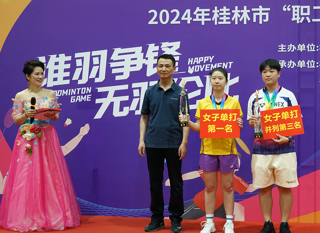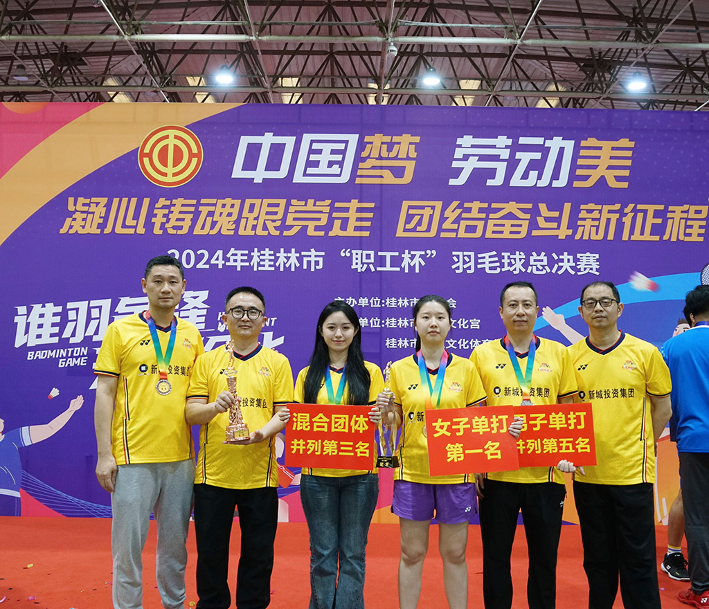 4月27日下午,由市總工會主辦的“中國夢 勞動美 凝心鑄魂跟黨走 團結(jié)奮進新征程”桂林市“職工杯”羽毛球比賽圓滿結(jié)束并舉行了頒獎儀式。新城投集團羽毛球隊經(jīng)過激烈角逐,在36支參賽隊伍中摘得多項榮譽:由公司黨委副書記(主持工作)、副董事長、總經(jīng)理朱毅擔任領(lǐng)隊,吳萍明、龔志祥、楊衛(wèi)來、張欣婭、唐蒙組成的新城投集團“黨旗映勝地”羽毛球隊榮獲團體第三名;張欣婭榮獲女子單打第一名;楊衛(wèi)來榮獲男子單打第五名的優(yōu)異成績。