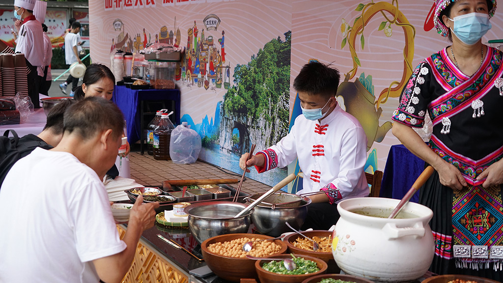 活動(dòng)現(xiàn)場(chǎng),“品非遺美食,游桂林山水”的主題引人入勝,桂林米粉、恭城油茶“非遺”文化展示及品嘗等活動(dòng)精彩紛呈。為確保活動(dòng)的順利進(jìn)行,宏謀酒管公司迅速組織了20名一線工作者,他們不懼烈日高溫,全心全意地投入到工作中。盡管汗水浸透了他們的衣衫,但他們始終保持著飽滿的熱情和專注,為新生們提供了優(yōu)質(zhì)的服務(wù)?;顒?dòng)現(xiàn)場(chǎng)氛圍火爆,總計(jì)供應(yīng)了2000碗米粉以及1500碗油茶,為初來乍到新生和家長(zhǎng)們帶來了一場(chǎng)別具特色的美食文化盛宴。