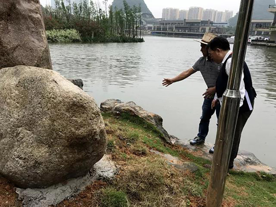 緊接著,檢查組冒雨檢查臨桂新區(qū)橋梁標識石的牢固情況。在現(xiàn)場聽取施工人員的介紹后,檢查組提出進入雨季后,降雨頻繁,要適時加強對橋梁標識石的沉降觀察,以確保基礎的安全、穩(wěn)固。