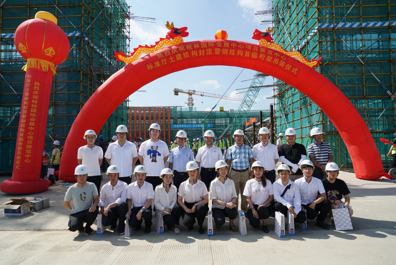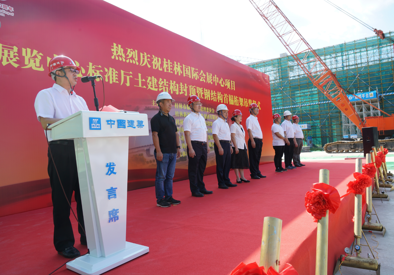 7月13日,桂林國際會(huì)展中心項(xiàng)目展覽中心標(biāo)準(zhǔn)廳土建結(jié)構(gòu)封頂暨鋼結(jié)構(gòu)首榀桁架吊裝儀式圓滿舉行。