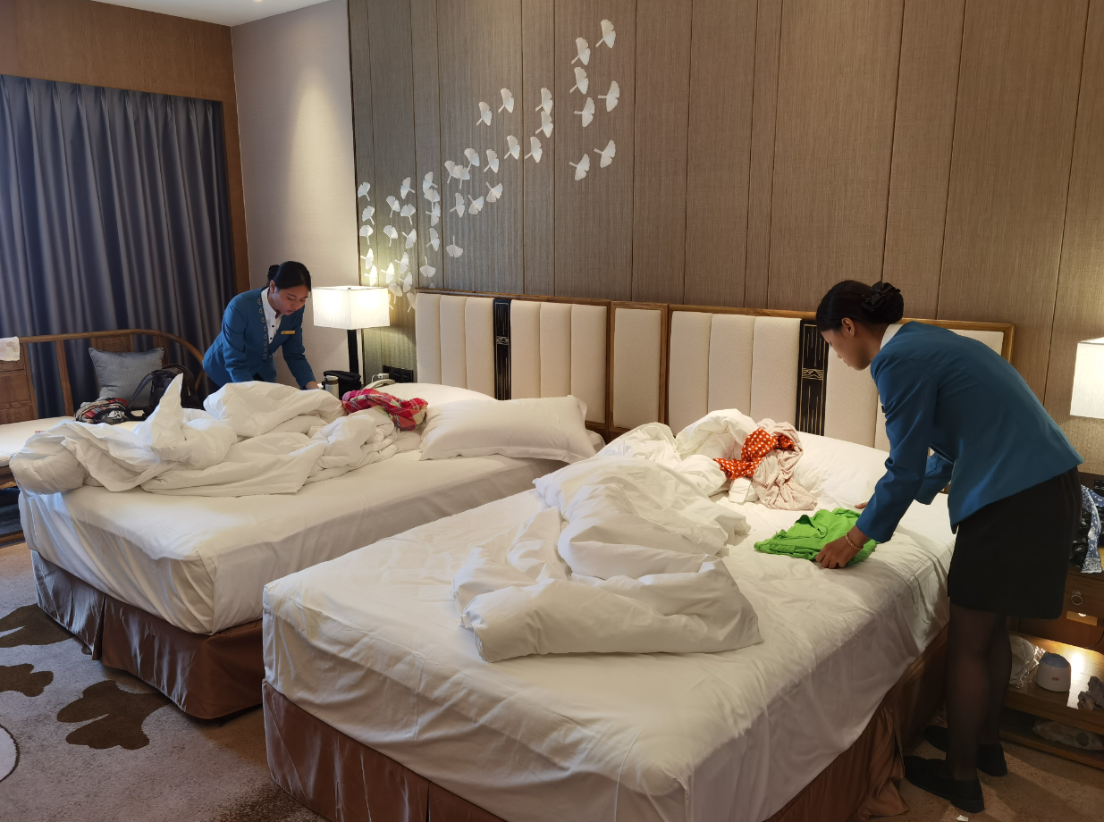 安全無小事。后勤保障部接到會議通知,提前開展消防安全演習(xí)、安全檢查、防疫控疫演習(xí)和全員疫情培訓(xùn),力求安保工作百密無一疏。餐飲部根據(jù)會務(wù)組提供賓客要求,精心準備菜單,并嚴格把控食品質(zhì)量安全;房務(wù)部認真梳理、精心準備,結(jié)合各國風(fēng)情特色,特別設(shè)計和布置客房;后勤保障部關(guān)注細節(jié),全程跟進服務(wù),設(shè)備間24小時派人值守,確保接待期間正常運轉(zhuǎn),重點加強巡檢力度,嚴格控制場內(nèi)場外安全管理,竭力配合做好安全保障工作;宴會部根據(jù)會場需求,隨時調(diào)整會場布置,用周密服務(wù)確保論壇及晚宴順利進行;市場部全程服務(wù)問題一對一開展對接跟進,確保每位遠到而來的客人都能在宏謀大酒店享受賓至如歸的體驗。