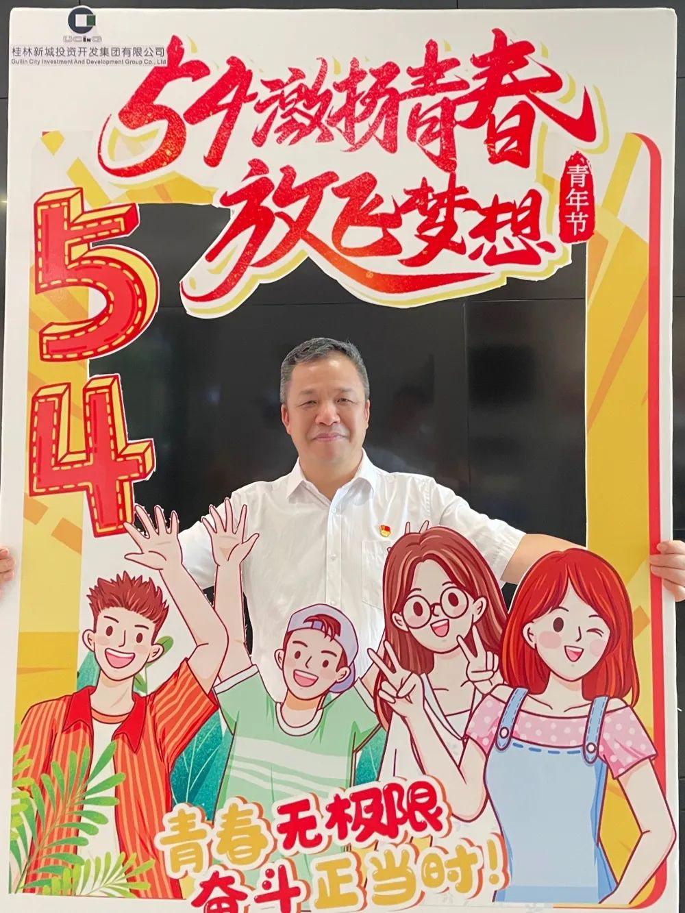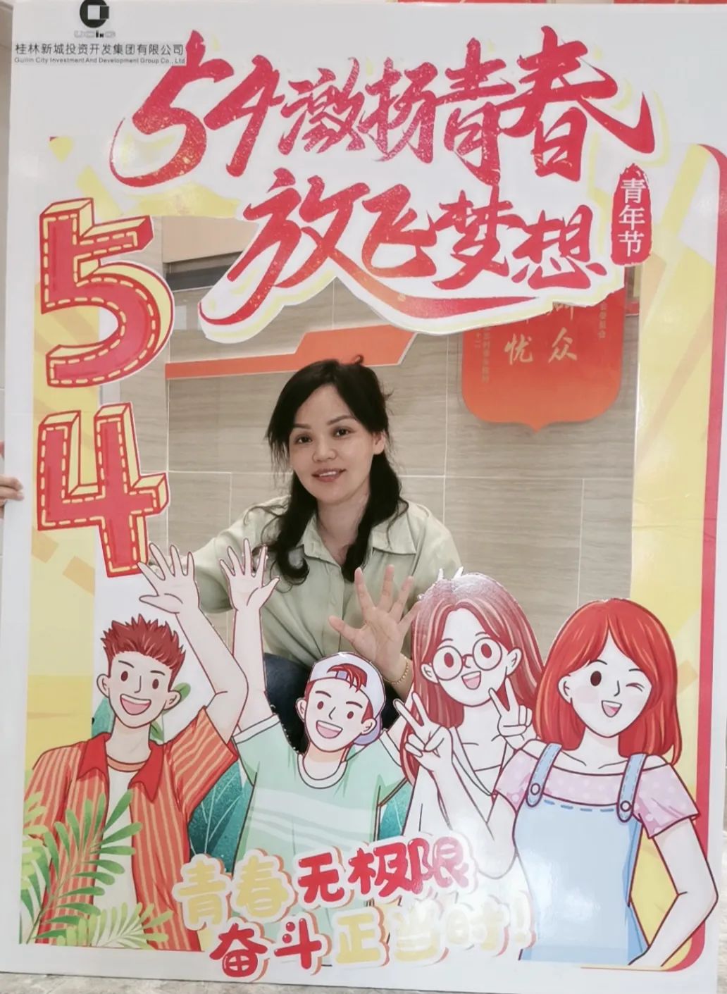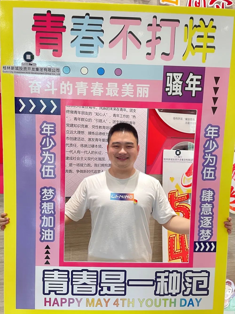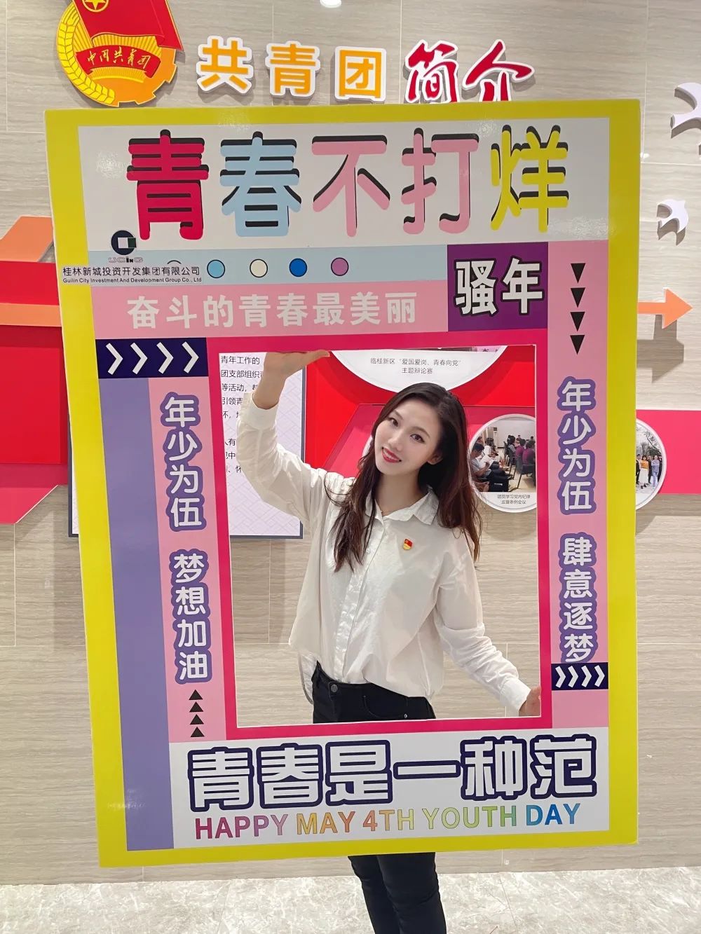 公司一樓大廳,團(tuán)支部布置了“五四主題”畫框打卡活動(dòng),熱烈慶祝五四青年節(jié)到來。周道林帶頭打卡,并鼓勵(lì)全體員工積極參與拍照打卡活動(dòng),渲染喜慶的節(jié)日氛圍。