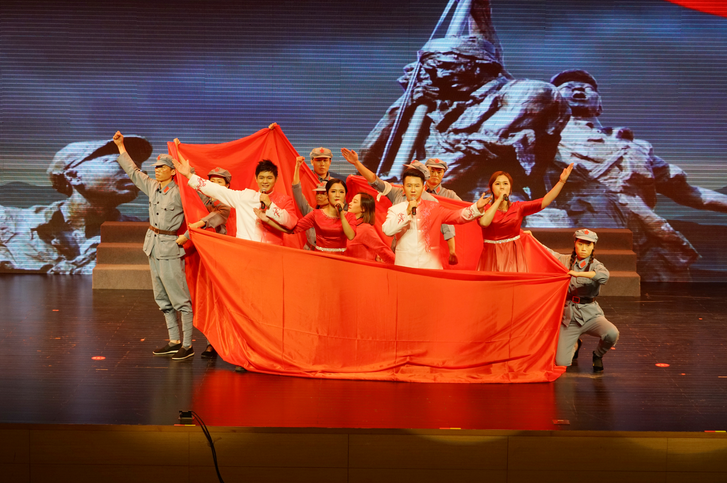 節(jié)目參演的12人分別來自集團(tuán)公司各部室、子公司的一線崗位。為了就老師空余時間集合排練,大家犧牲周末、中秋、下班晚上時間練舞、朗誦,分工不分家,相互配合,一點(diǎn)不含糊,一個多月的排練,才換來了這次來之不易的集體榮譽(yù)。他們用真摯的情感和生動的語言,演繹了紅五團(tuán)里一面彈跡斑斑的英雄戰(zhàn)旗的故事。這面戰(zhàn)旗引領(lǐng)大家穿越時空,重回革命年代,身臨其境地感受革命先烈們的偉大情懷和感天動地的英雄事跡,一句句飽含真情的臺詞,誦出了新城投人對黨深情而堅(jiān)定、樸素而真摯的告白,贏得了現(xiàn)場觀眾和評委的陣陣掌聲。