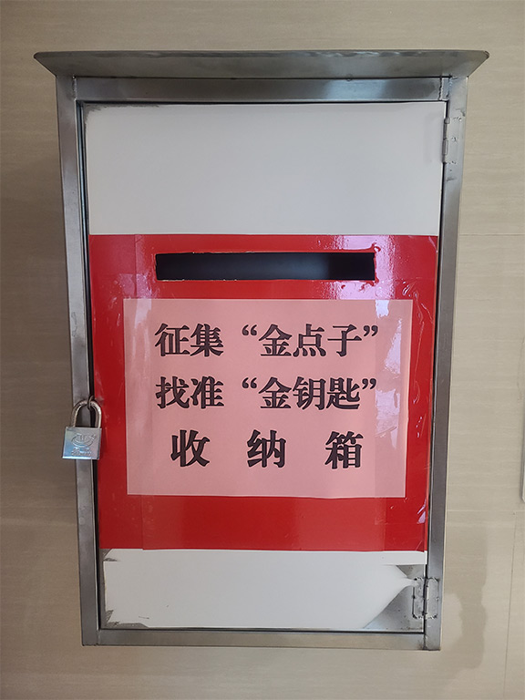 在公司15樓設置征集“金點子”找準“金鑰匙”收納箱,直接由總經(jīng)理開取收納箱??偨?jīng)理將根據(jù)方案的可行性安排時間與提出方案的個人及團隊見面,聽取方案介紹,探討落實對策。